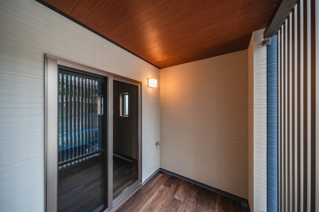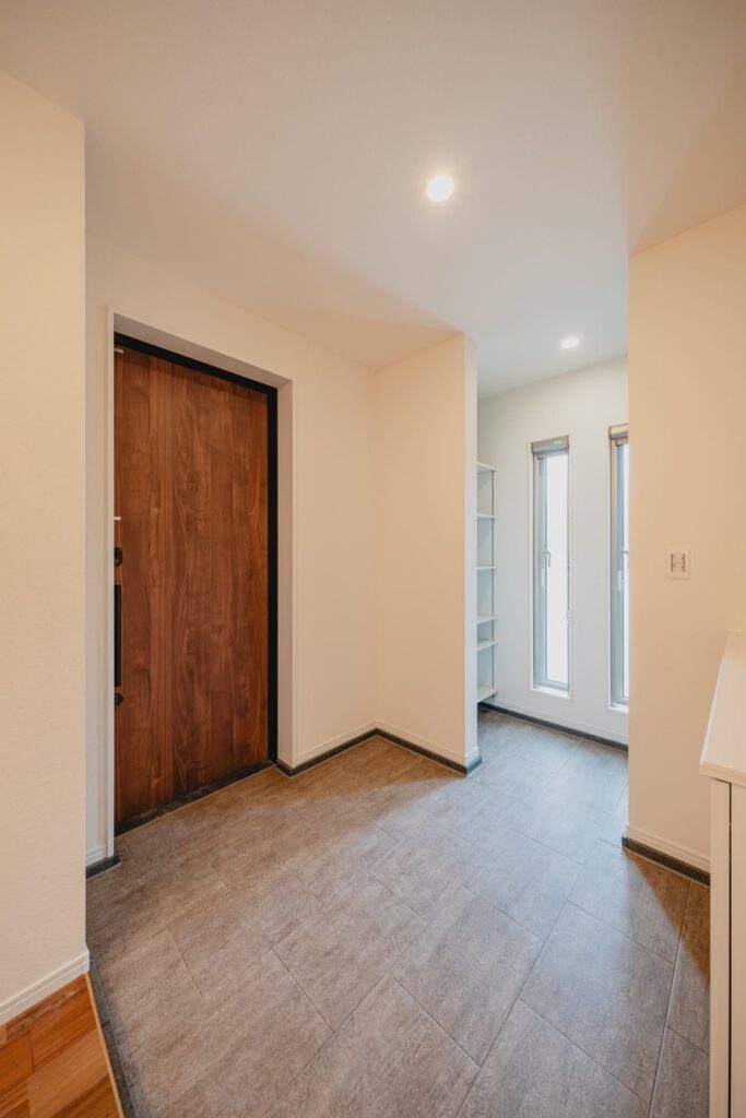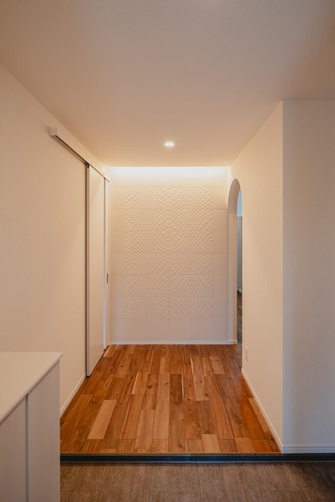 扉を開けると、広々とした玄関ポーチが家族を迎え入れます。壁面には調湿・脱臭効果のあるエコカラットを贅沢に配置。デザイン性と機能性を両立させた、ゲストを魅了する美しいエントランスに仕上げました。