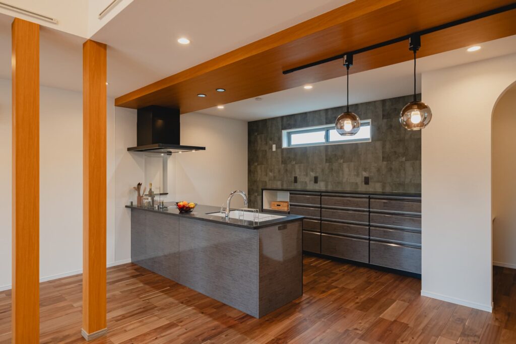 LDKの主役となるのは、スタイリッシュな対面式キッチンです。下がり天井を施すことで空間を緩やかに区切り、まるでお洒落なカフェのような雰囲気に。背面の食器棚に加え、冷蔵庫スペースもしっかり確保し、機能的な配置になりました。