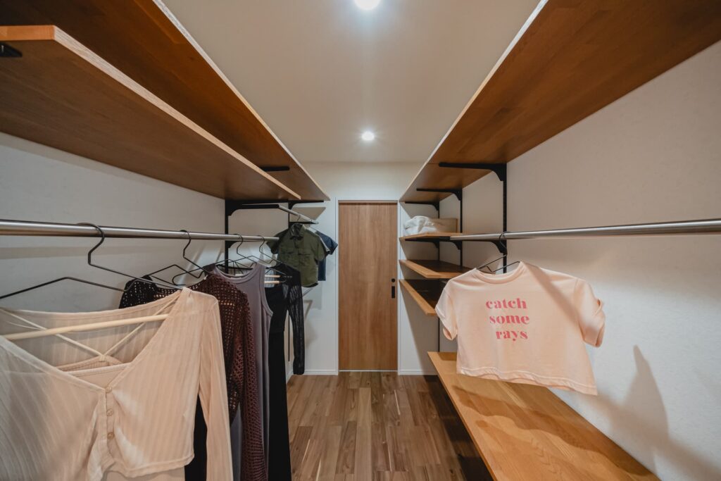 リビングや寝室、そして水回りからもアクセスしやすい中央に配置された、大型のファミリークローゼット。枕棚やハンガーパイプを効率よく配置し、衣類を1箇所で管理できる「家事らく」の要となる空間です。