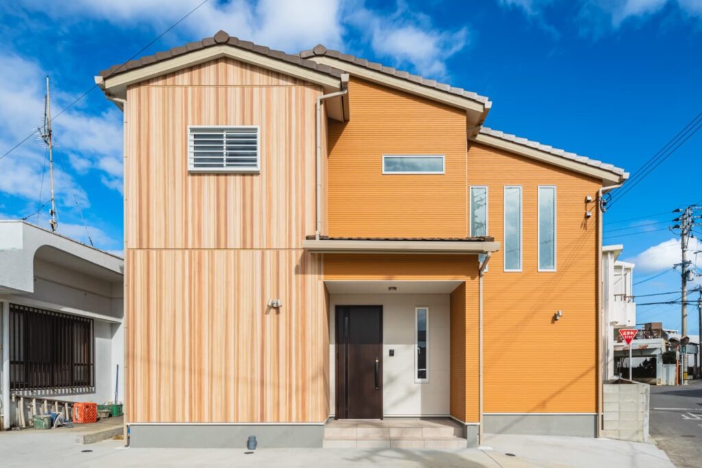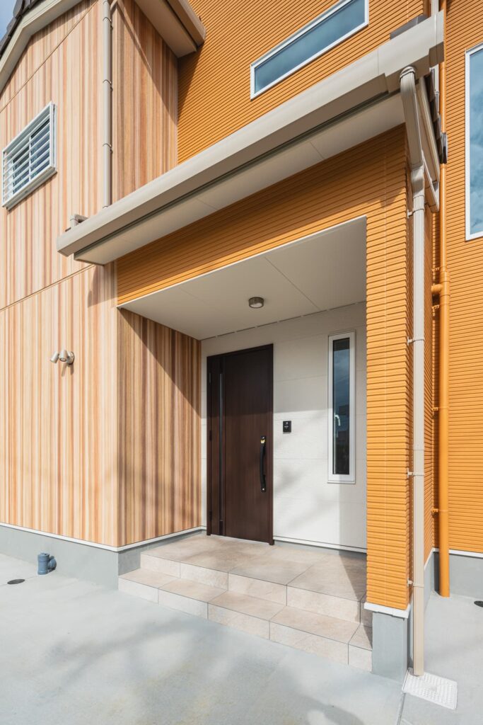 最大の特徴は、質感の異なる2種類のサイディングを大胆に使い分けたデザイン。 正面左側には、木目の流れが美しい縦張りのナチュラルウッドを採用し、スタイリッシュな垂直ラインを強調。一方で、右側には温かみのあるオレンジ系の横張りを組み合わせることで、現代的なシャープさと、帰宅時にホッとさせてくれるような柔和な表情を両立させました。