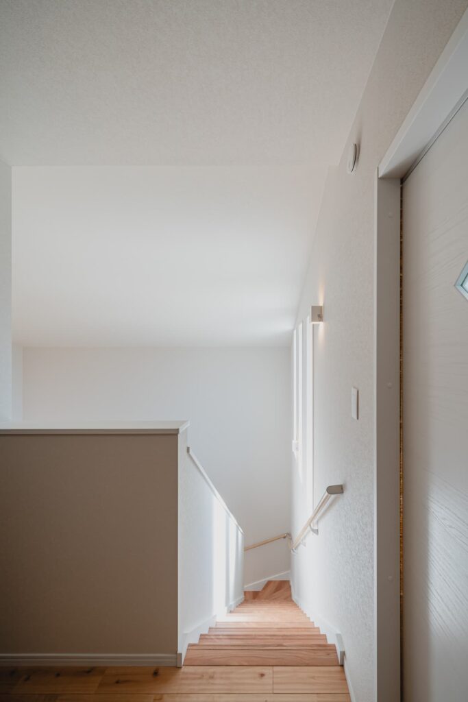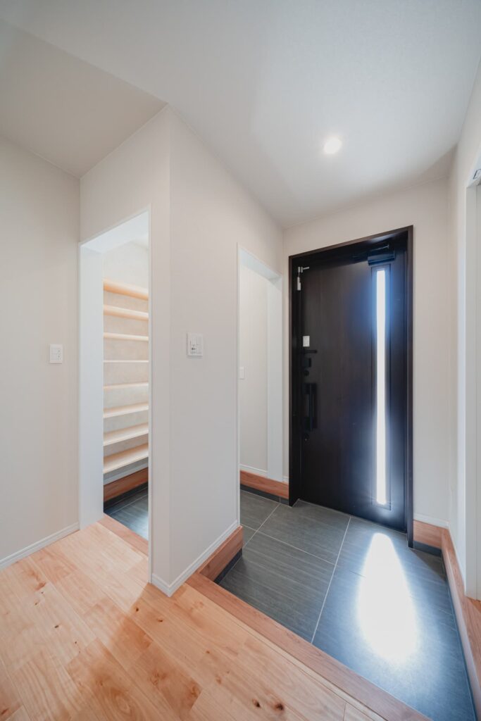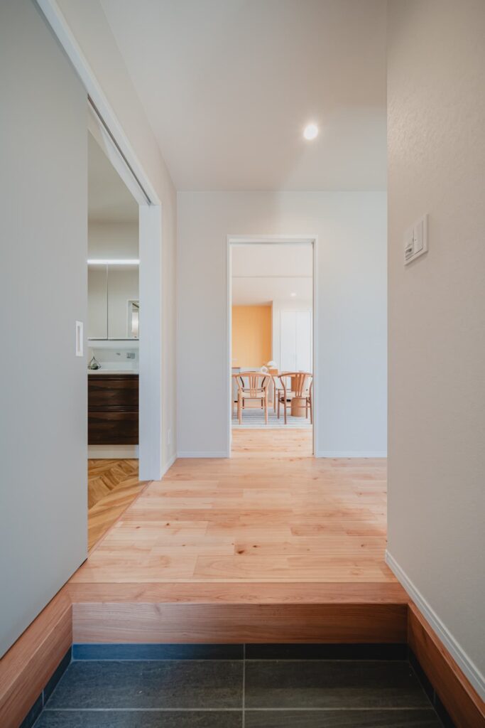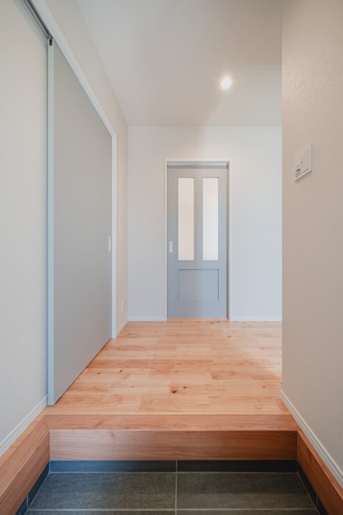 リビングへと続くドアには、トレンドのニュアンスグレーを採用。明るい木目のフローリングとの相性も抜群で、空間を洗練された印象に。スリットガラスからのぞくリビングの光が、奥行きと開放感を演出します。