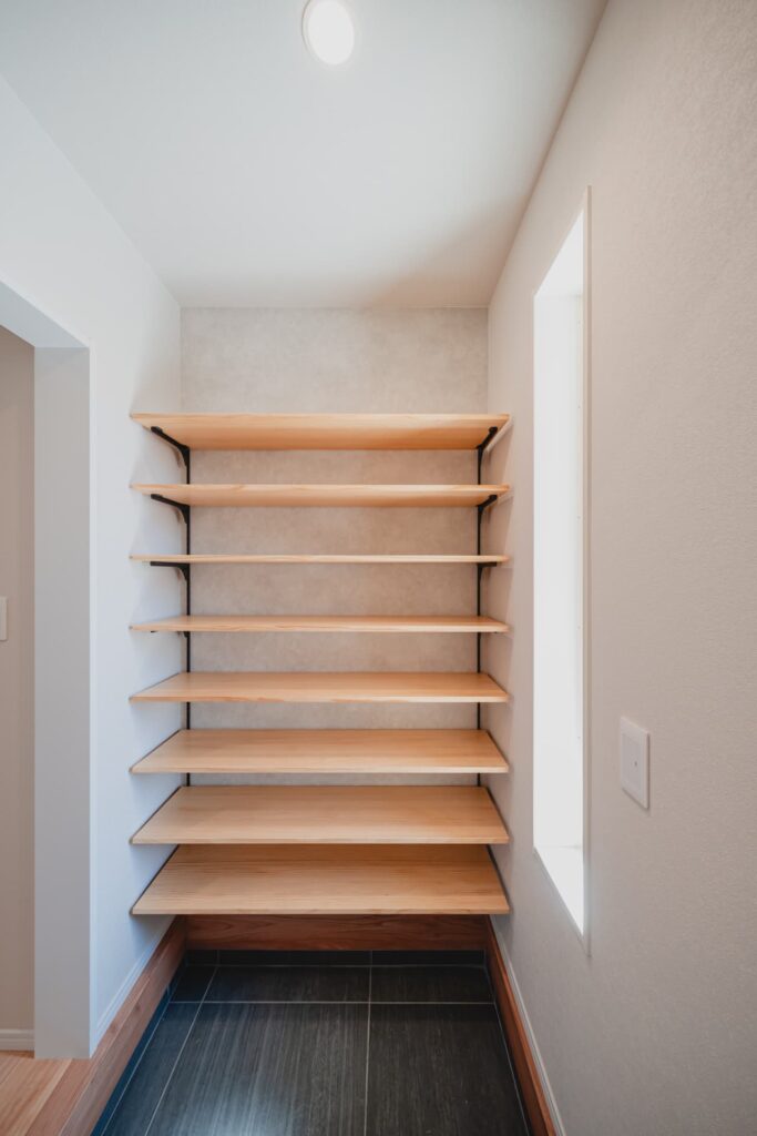 玄関の隣には、土間続きでスムーズに出入りできるウォークイン・シューズクロークを配置しました。可動棚には家族全員の靴はもちろん、アウトドアグッズやベビーカーなどもスッキリ収納。