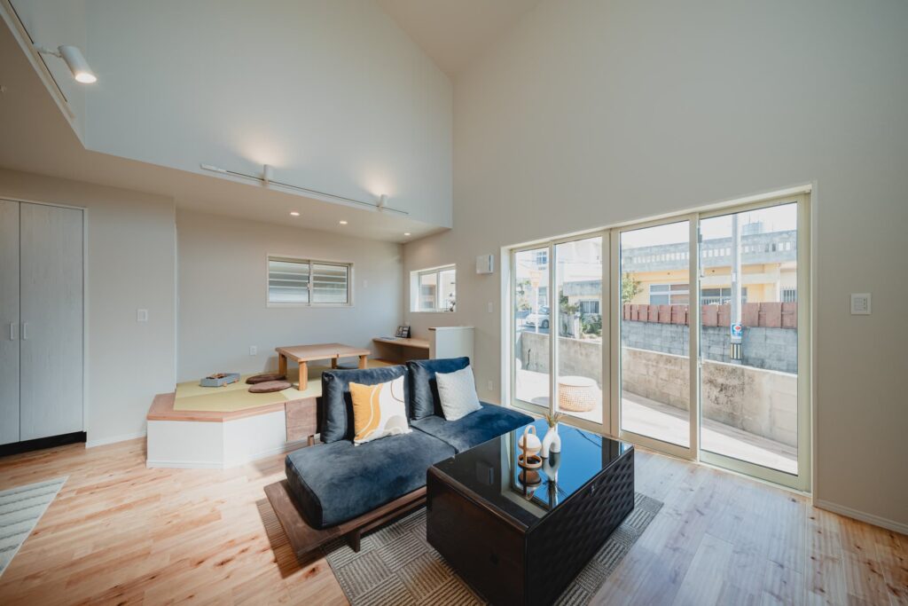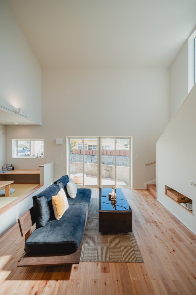 ■24帖の大空間。吹き抜けと小上がりが生む、開放感あふれるリビング