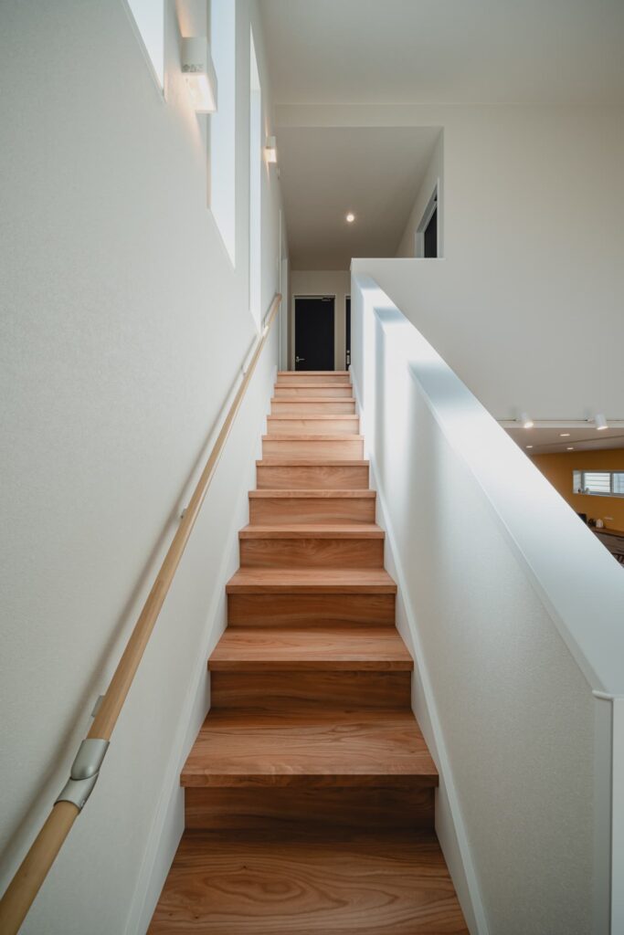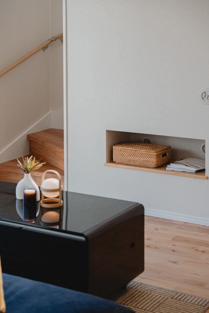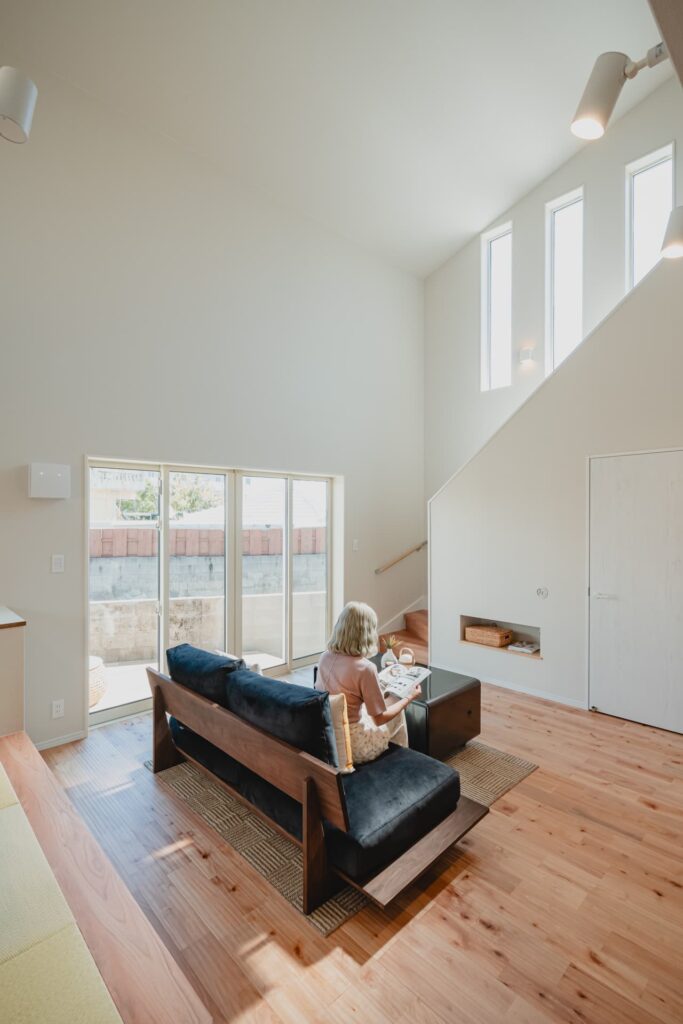 このお住まいの中心となるのは、ゆったりとした24帖の広さを誇るLDK。 ただ広いだけでなく、リビング上部に大胆な吹き抜けを設けることで、圧倒的な開放感を創出しました。高窓から差し込む自然光が白い壁に反射し、空間全体を隅々まで明るく照らします。