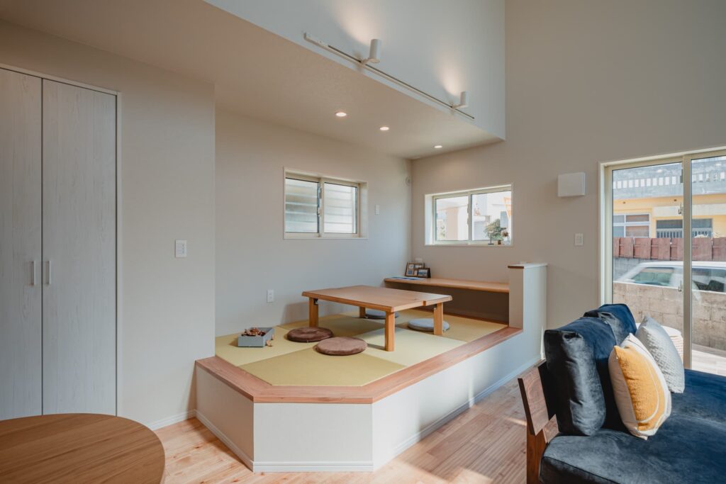 リビングの一角には、段差を利用した小上がりのタタミ空間を配置。