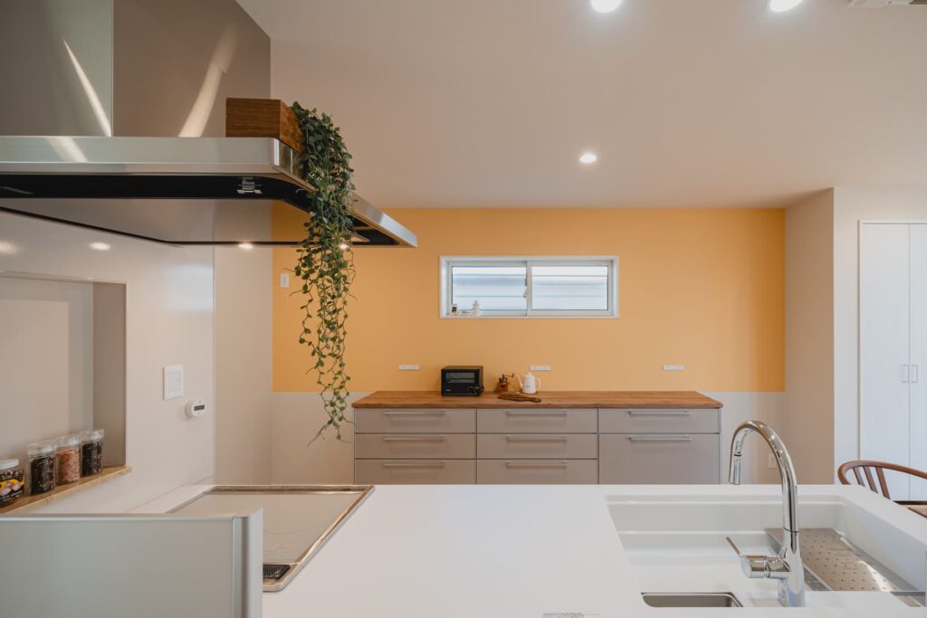 ご夫婦こだわりのマスタードイエローのアクセントクロス。キッチン背面に配置されたこのカラーが、空間全体をパッと明るく彩ります。