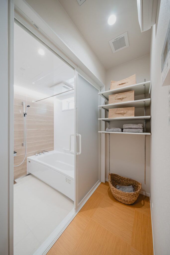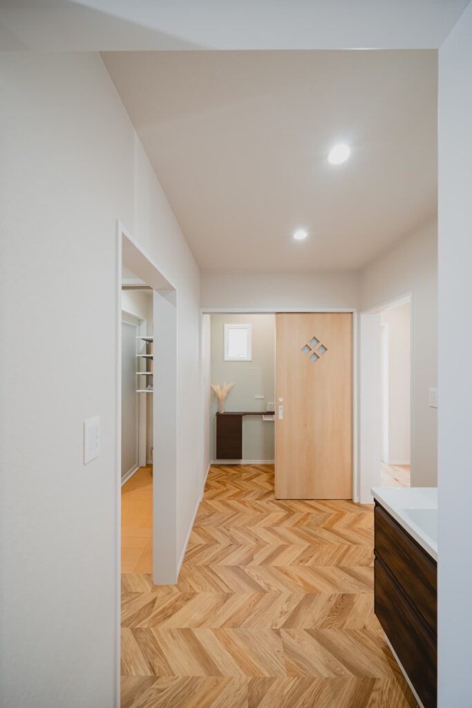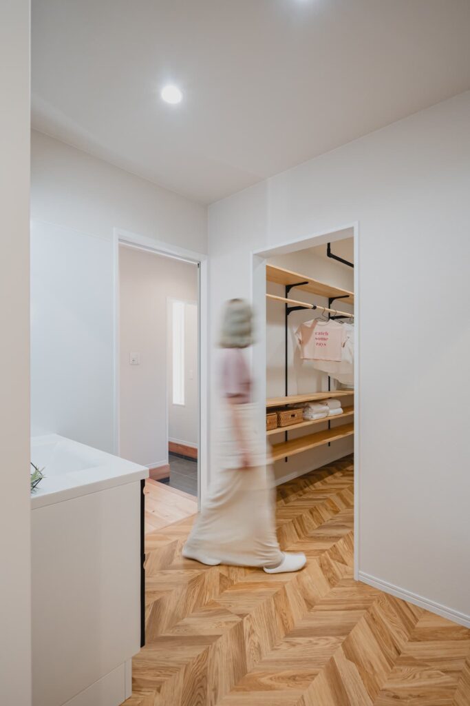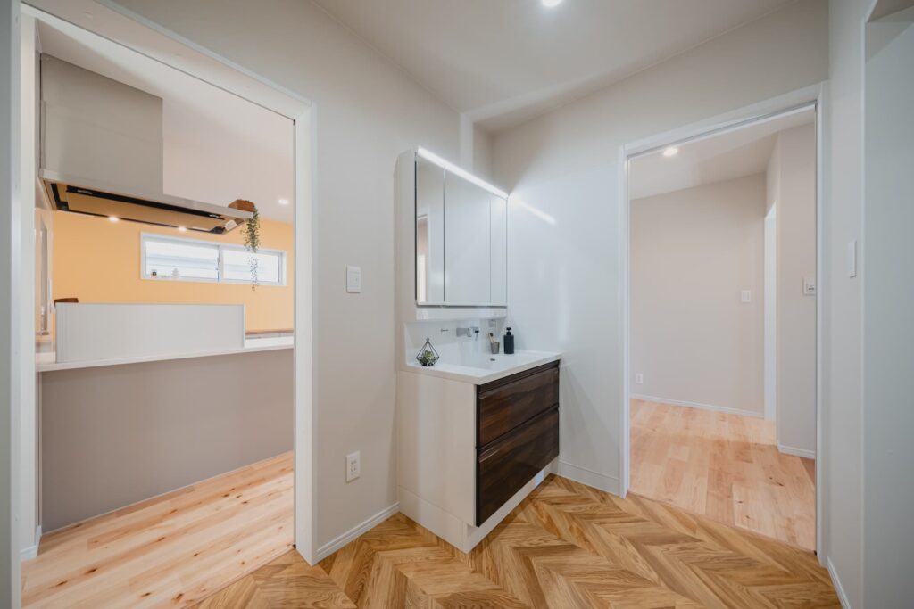 このお住まいの見どころの一つが、緻密に計算された水回りの回遊動線です。 玄関から直接アクセスできる「ただいま動線」と、キッチンからすぐ移動できる「家事動線」が交差する場所に洗面・ランドリールームを配置。家事の効率を極限まで高め、忙しい毎日をサポートします。