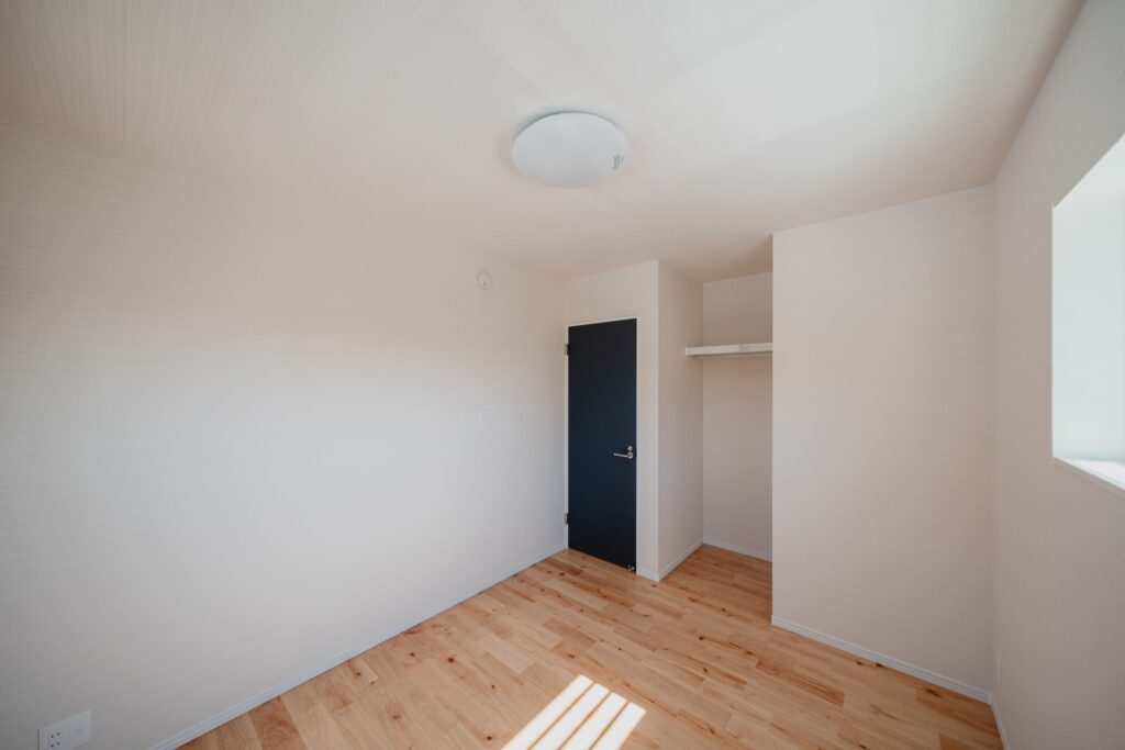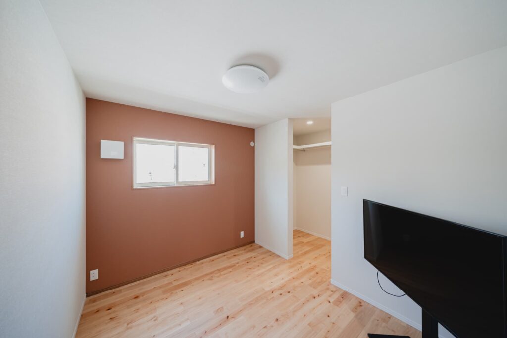 1日の疲れを癒やす寝室には、落ち着いたテラコッタカラーのアクセントクロスを採用しました。