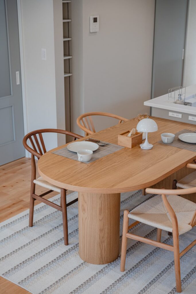 そして、キッチンは遮るもののないフルフラットタイプを採用。料理をしながらでもダイニングやリビングにいる家族と視線を合わせ、会話を楽しむことができます。清潔感のあるホワイトのワークトップと、スタイリッシュなグレーのキャビネットが、インテリアに美しく溶け込みます。